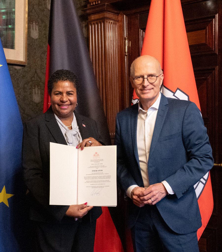 Hamburgo, Alemania. En un acto oficial celebrado en la sala de recepción del Primer alcalde, en la Cancillería del Senado de la Ciudad Libre y Hanseática de Hamburgo, el Primer alcalde Sr. Peter Tschentscher entregó a la Cónsul General de la República Dominicana en Hamburgo, Dra. Elsa de León, el exequátur que avala oficialmente su autorización para ejercer sus funciones consulares en esta ciudad.